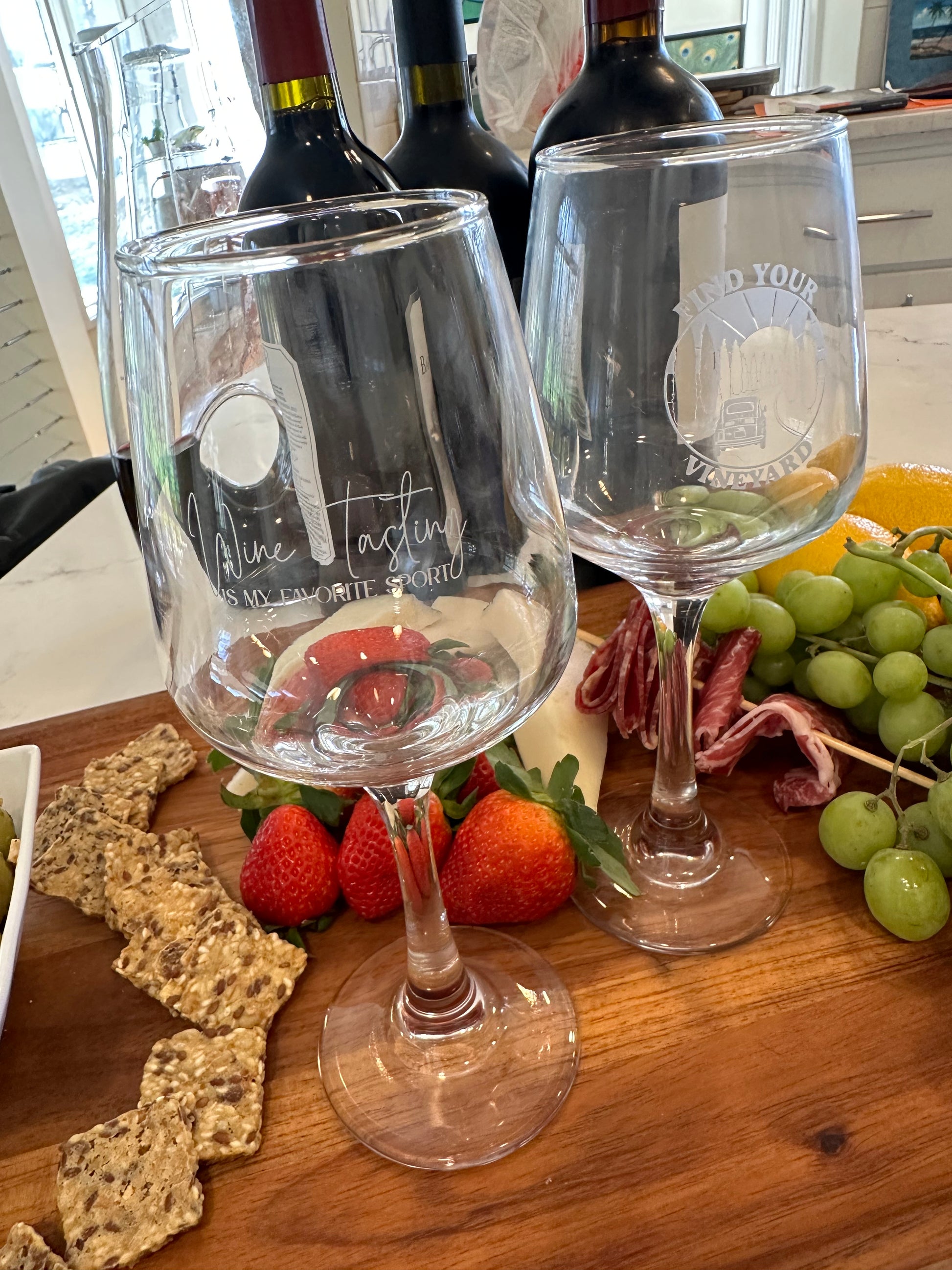 Introducing our Wine Glasses - the perfect companion for your wine adventures. Unleash the full potential of every sip as you swirl, inhale, and taste the exquisite flavors of your favorite grape varietals. Choose between our elegant etchings: "Find Your Vineyard" or "Wine Tasting is My Favorite Sport." With a generous 16 oz capacity, these glasses elevate your wine experience. Raise a toast to indulgence and sophistication with these exquisite wine glasses.